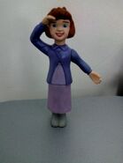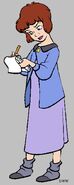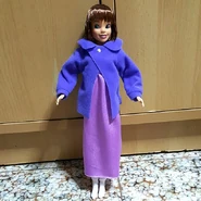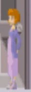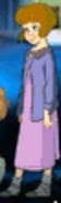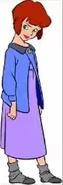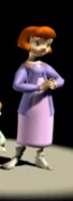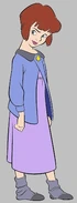 Jane is seen; with a purple jacket, a pink short-sleeved calf-length nightgown and grey socks.